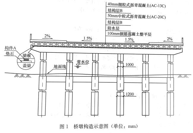 某公司承建一座城市橋梁,該橋上部結(jié)構(gòu)為6×20m簡(jiǎn)支預(yù)制預(yù)應(yīng)力混凝土空心板梁,每跨設(shè)置邊梁2片,中梁24片;下部結(jié)構(gòu)為蓋梁及Φ1000mm圓柱式墩,重力式U型橋臺(tái),基礎(chǔ)均采用Φ1200mm鋼筋混凝土鉆孔灌注樁。橋墩構(gòu)造如圖1所示。