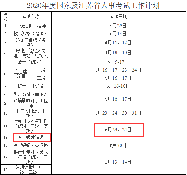 近日,江蘇省人事考試網發布了2020年江蘇省人事考試工作計劃,內容提到,2020年江蘇二級建造師考試時間確定為5月23、24日。接下來,中智教育帶大家了解一下信息詳情!