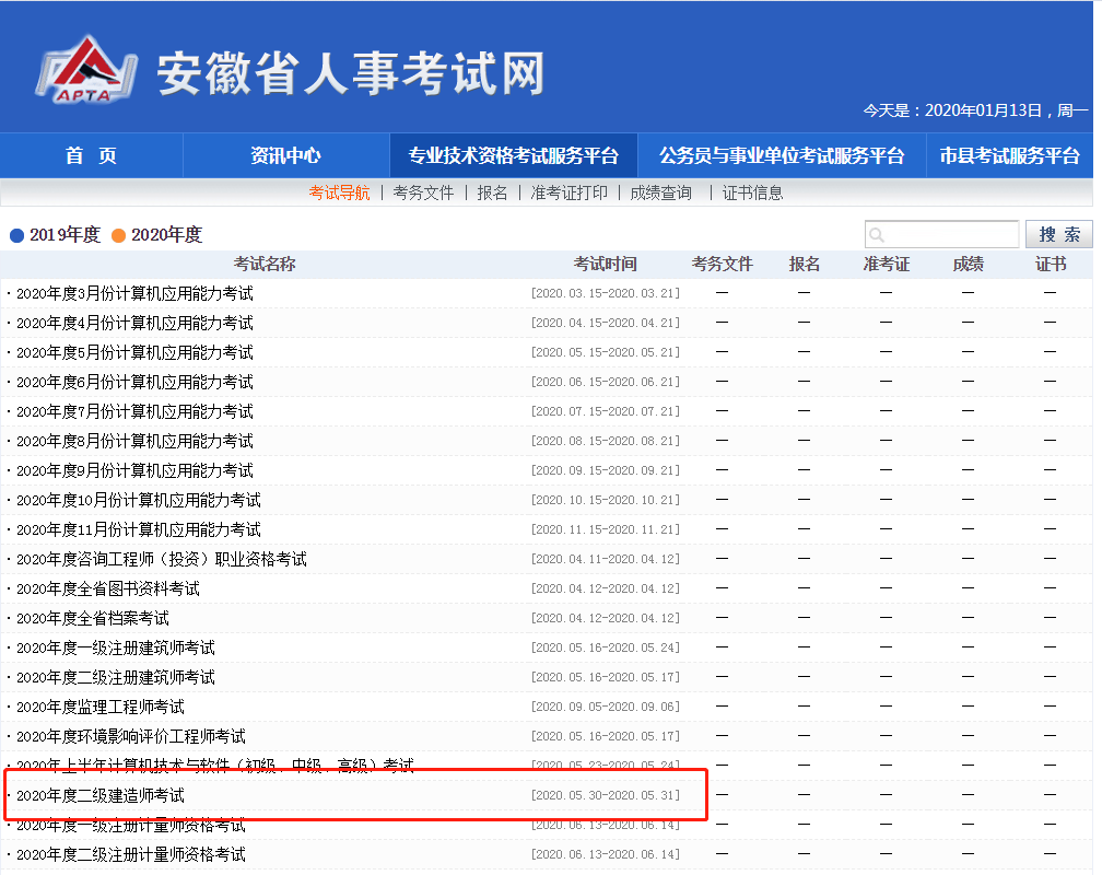 2020年1月13日,兩個省市公布了二級建造師的考試時間,分別是新疆和安徽兩個省市,我們從官方的考試網(wǎng)站新疆省人事考試網(wǎng)和安徽省人事考試網(wǎng)得到了具體的考試時間,我們來看一下具體的時間通知。