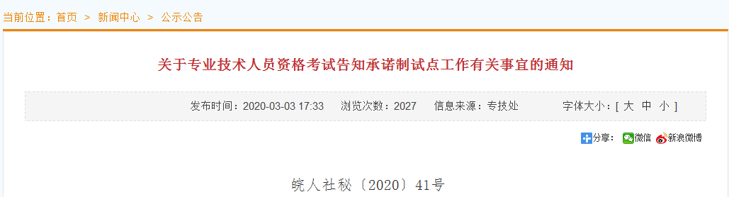 安徽省人力資源和社會保障廳發布《關于專業技術人員資格考試告知承諾制試點工作有關事宜的通知》。