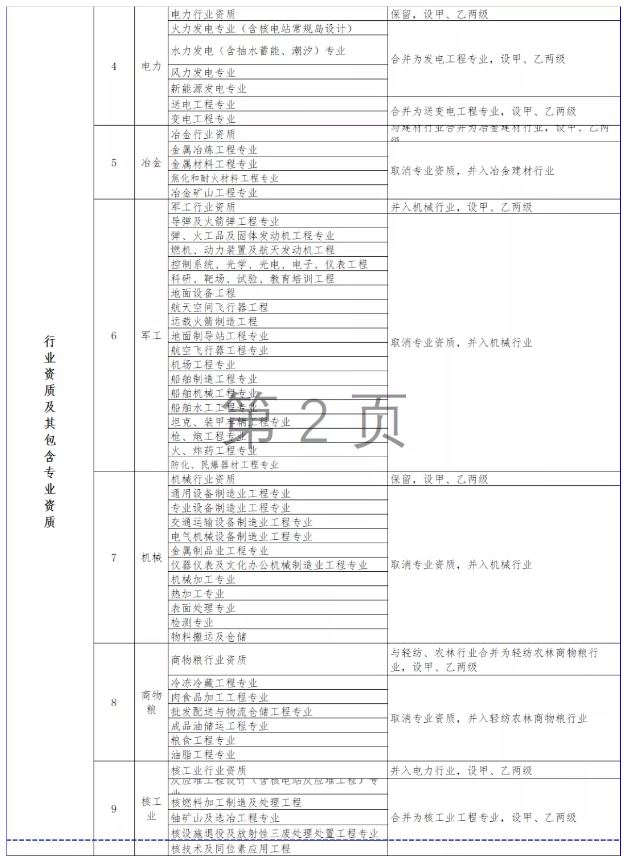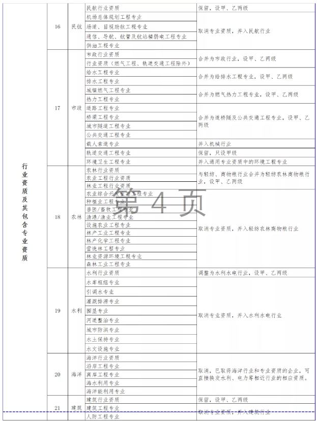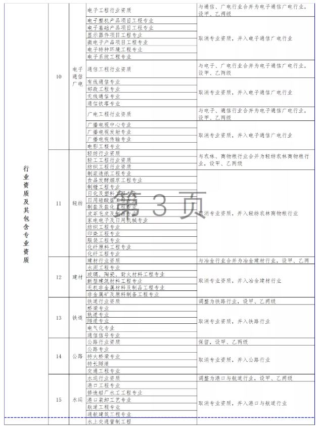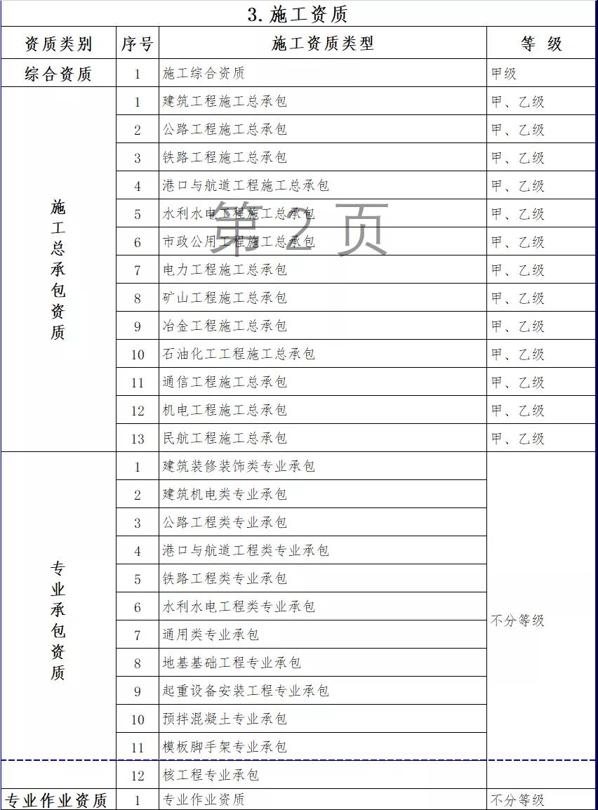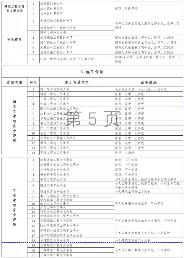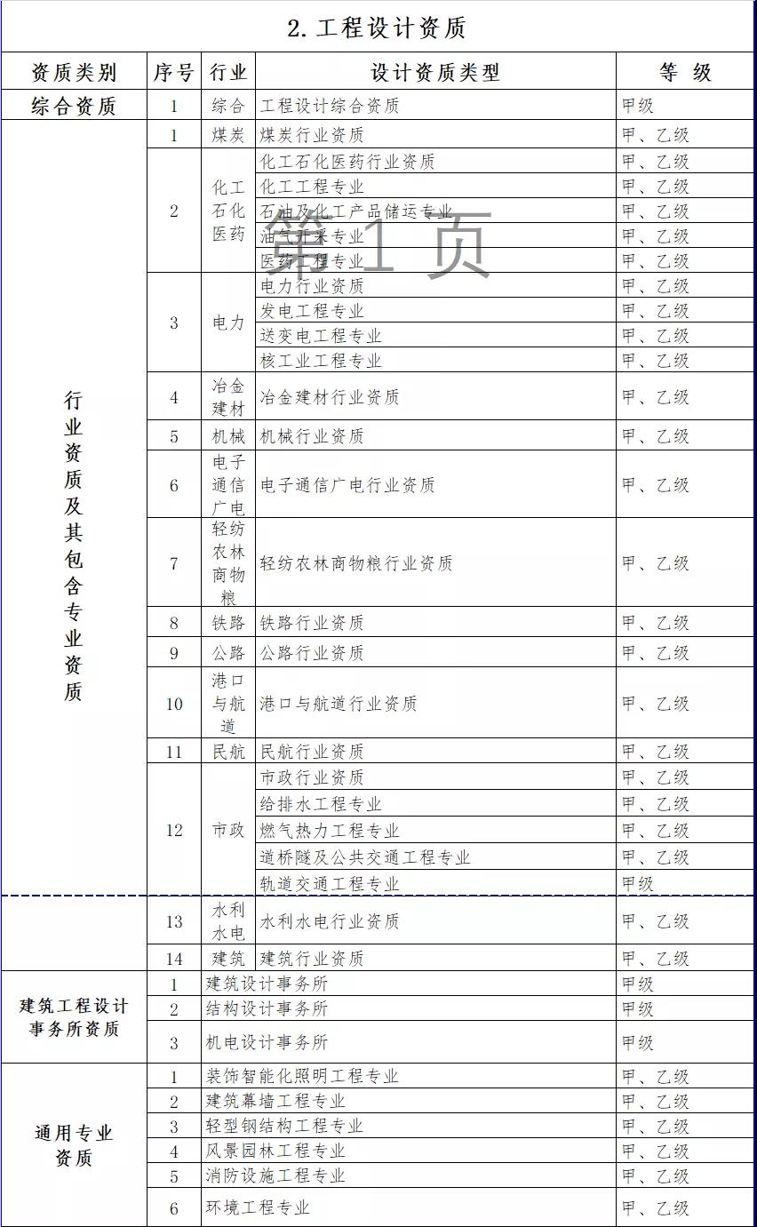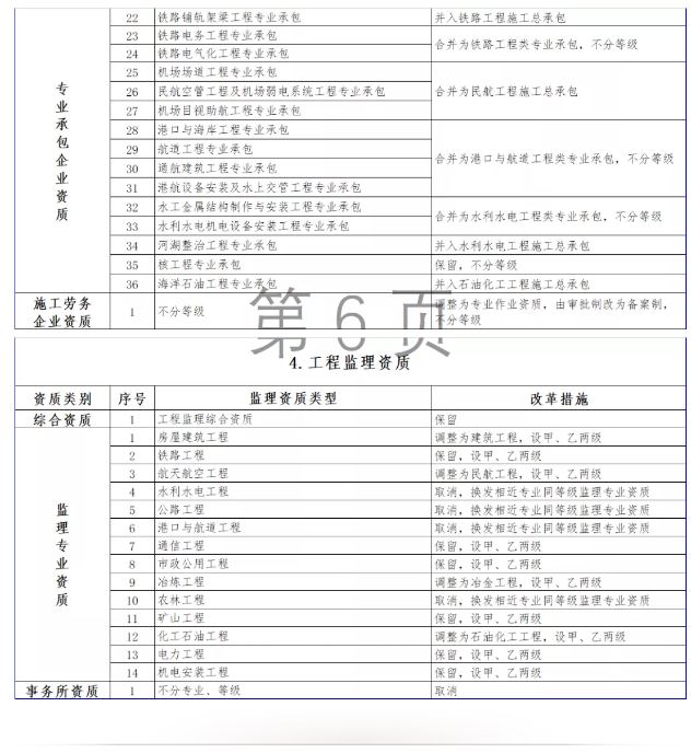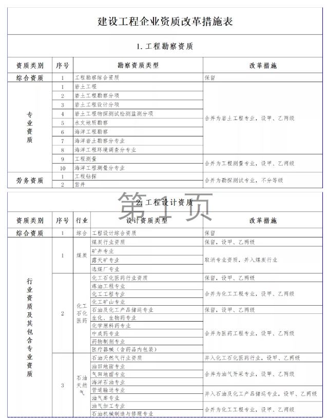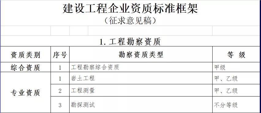 按照國務院深化“放管服”改革部署要求,大幅壓減企業(yè)資質類別和等級(改革措施詳見附件3)。改革后,工程勘察資質分為綜合資質和專業(yè)資質,工程設計資質分為綜合資質、行業(yè)資質、專業(yè)資質和事務所資質,施工資質分為綜合資質、總承包資質、專業(yè)承包資質和專業(yè)作業(yè)資質,工程監(jiān)理資質分為綜合資質和專業(yè)資質。